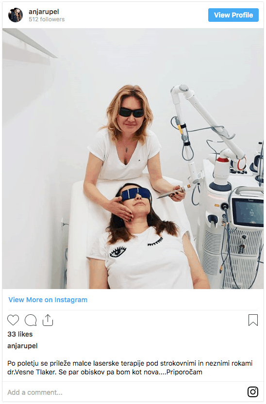 v medicinskem centru Dermagologija.si je skrb za ohranjanje zdravja in kakovosti kože naša najvišja prioriteta. Našim pacientom in strankam svetujemo v zvezi z zaščito pred soncem, uporabo ustrezne negovalne kozmetike in domačo nego, s spektrom neinvazivnih pomlajevalnih laserskih tehnik pa poskrbimo za svež in naraven videz. Zaupa nam tudi Anja Rupel, ki si je po poletnih počitnicah privoščila lasersko terapijo in se prepustila »strokovnim in nežnim rokam« naše dr. Vesne Tlaker.